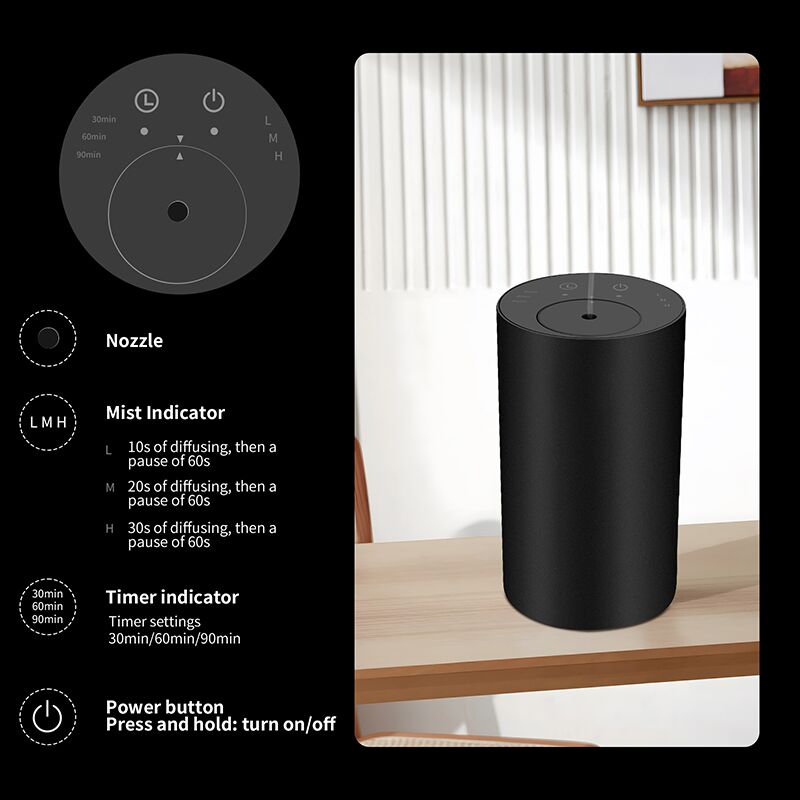 Note: in order to avoid forgetting to shut down, the essential oil consumption is too fast, and the default intermittent working time is auto colsed for 4 hours. mistoutput setting(10s ON/60s OFF, 20s ON/60s OFF, 30s ON/60s OFF as cycle running).
